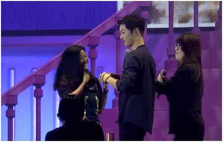 宋仲基欧巴真的很努力,为粉丝实现愿望清单,朗诵中文诗、波斯美女动作献爱意给“松果”、为生日粉丝唱生日歌送祝福等。温暖的笑容,宠溺的口吻,一度迷倒众粉丝,引爆见面会现场高潮。
